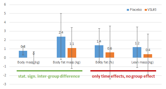 Since there were neither significant differences in body fat% due to the lower lean mass gains in the probiotic group and considering the fact that there were no additional health effects in form improvements in insulin sensitivity or fat oxidation. Since neither of them was affected by the overfeeding, anyways, the significance of the lack of change is questionable.